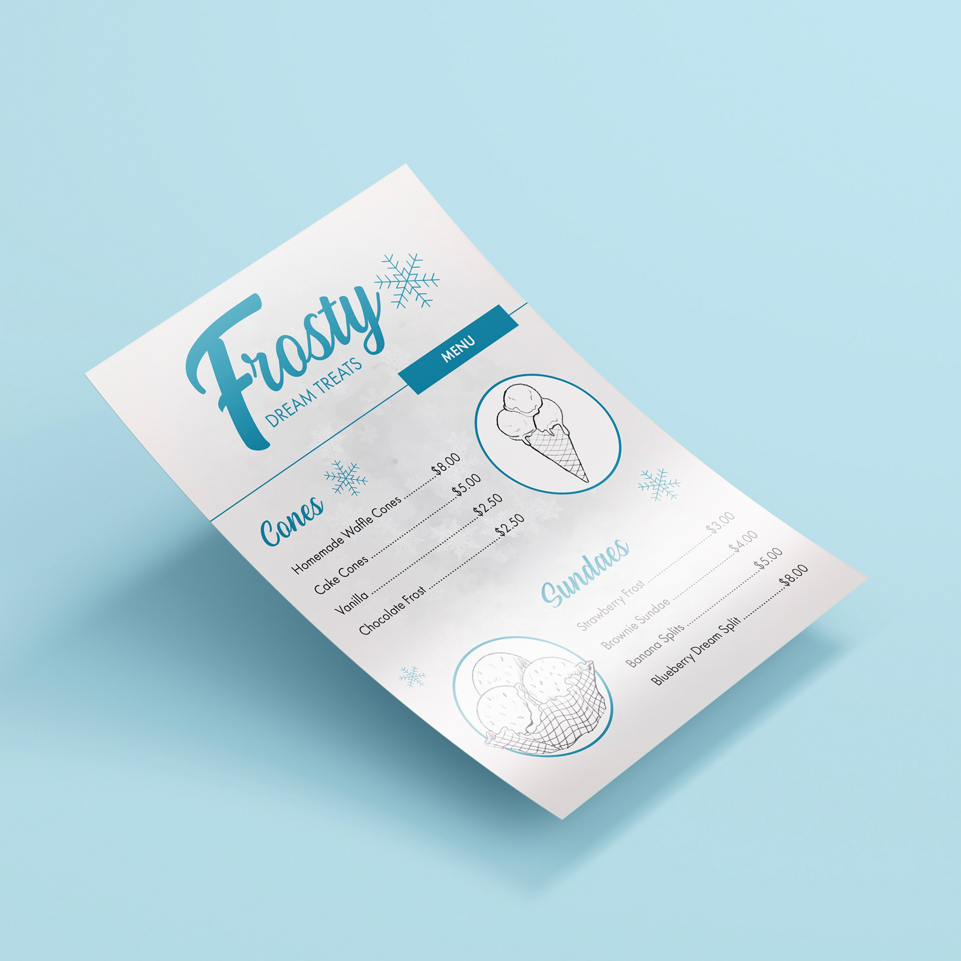 I hand-drew the ice cream illustrations of various ice cream cones and sundaes, To enhance the wintry vibe, I incorporated delicate snowflake effects throughout the design, which not only represent the shop's frosty name.