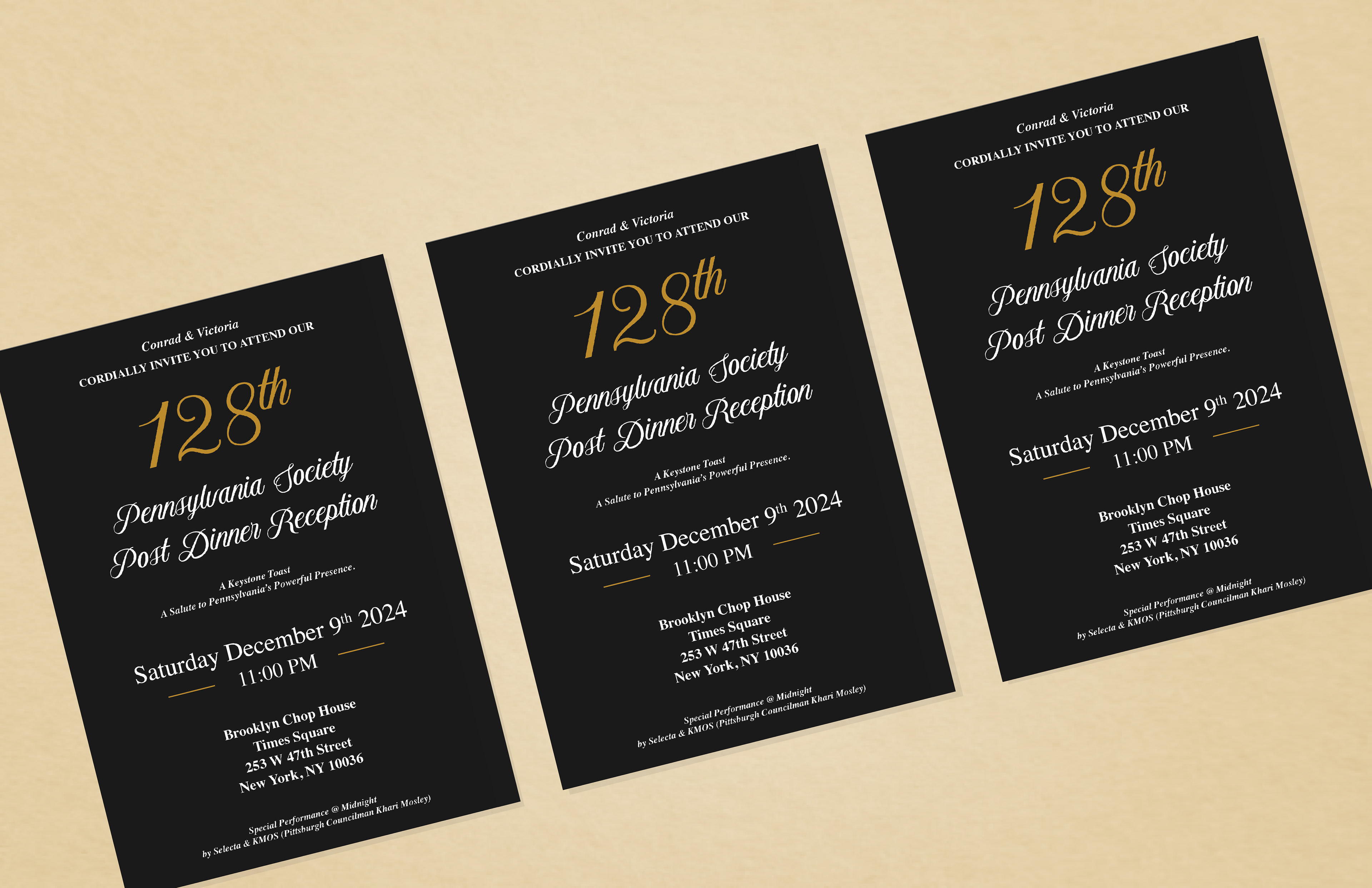I went with this design concept because I really wanted to create an elegant vibe, something that feels like a classy gala. I love the font choices—they have such a fancy touch and the gold and black combination just feels so rich and inviting. It all comes together to create a warm, sophisticated atmosphere that I think people will really enjoy!